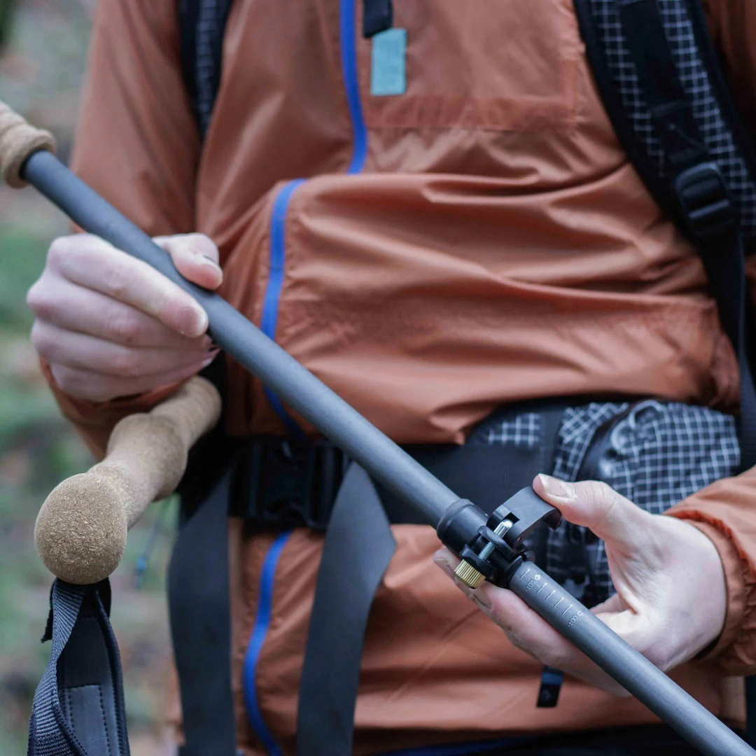 Kolfiberskaftet är lätt men extremt starkt och minskar belastningen samtidigt som det ger stabilt stöd – perfekt för långa turer.